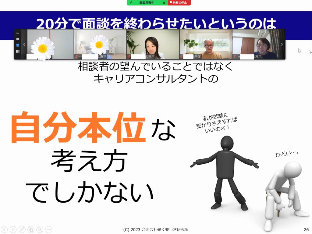 八阪先生の研究所は、以前大学のキャリアセンターに在籍していた時にセミナー資料を拝見させて頂きましたが、私には難しいという先入観がありましたが本日の講座で、とてもわかりやすい。キャリアコンサルティングで大切にすることをたくさん教えて頂きました。