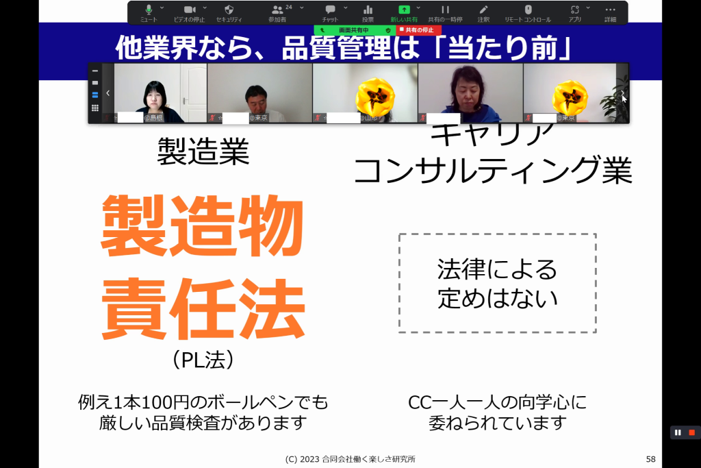 これは常に念頭において学びを継続するようにしていますが、本日八阪先生からも同じ言葉を聴くことができたこと、嬉しかったです。表面的な受容共感で一見スムーズに見える面談ではなく、人生を左右する責任の重さを自覚し“品質管理”をしっかり行っていきたいと思います。