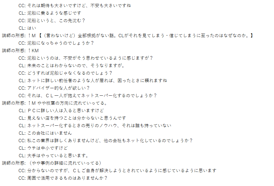 試験対策をはじめてから、「CLのお話を一字一句漏らさず聴かなければ…」というようになっていましたが、その考え自体がCC主体だったと反省しています。CLのお話に強弱があること、話の本質と枝葉があること…今回参加して、やっと少し掴めてきたように思います。 ありがとうございました。
