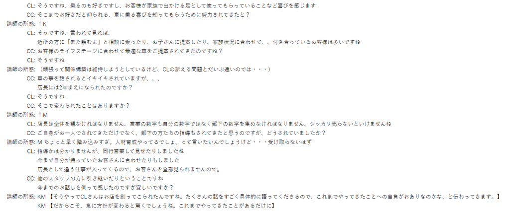 面談におけるポイントとしては、CC視点の問題点と具体的展開がリンクしているかどうか、具体的展開における方策は今目の前にいらっしゃるCLさんが受け入れてくださるものになっているかどうか、そして、もしCLさんのお気持ちや要望が置き去りになっているように感じたなら、それを素直にお伝えし、CLさんの思いを丁寧に確認しながらギャップを埋めていく作業を行うことが必要、ということを学びました。