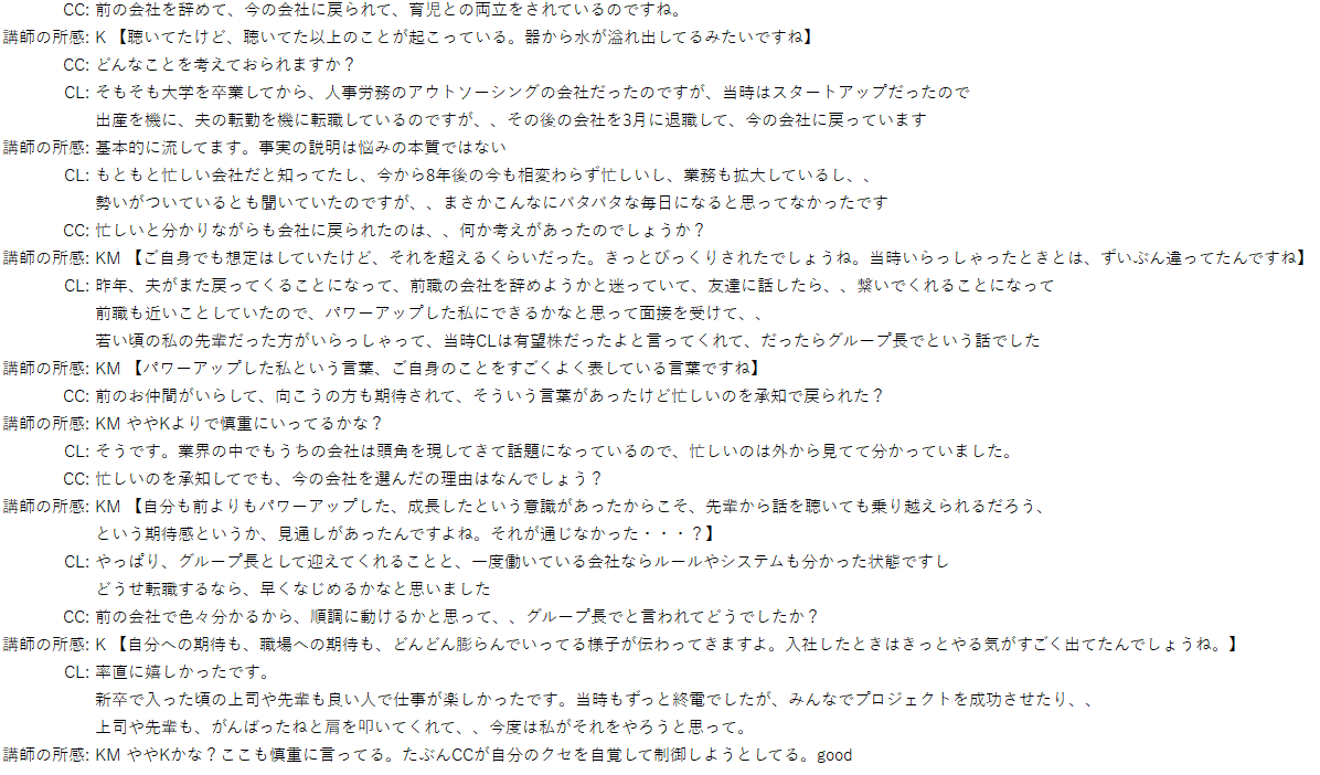 CLの言葉を代弁する効果で、”CL視点に立ったらこんな風に見えるけど…”という話し方使えたらいいなと思いました。修正しながら頑張っていきたいです。ありがとうございました。