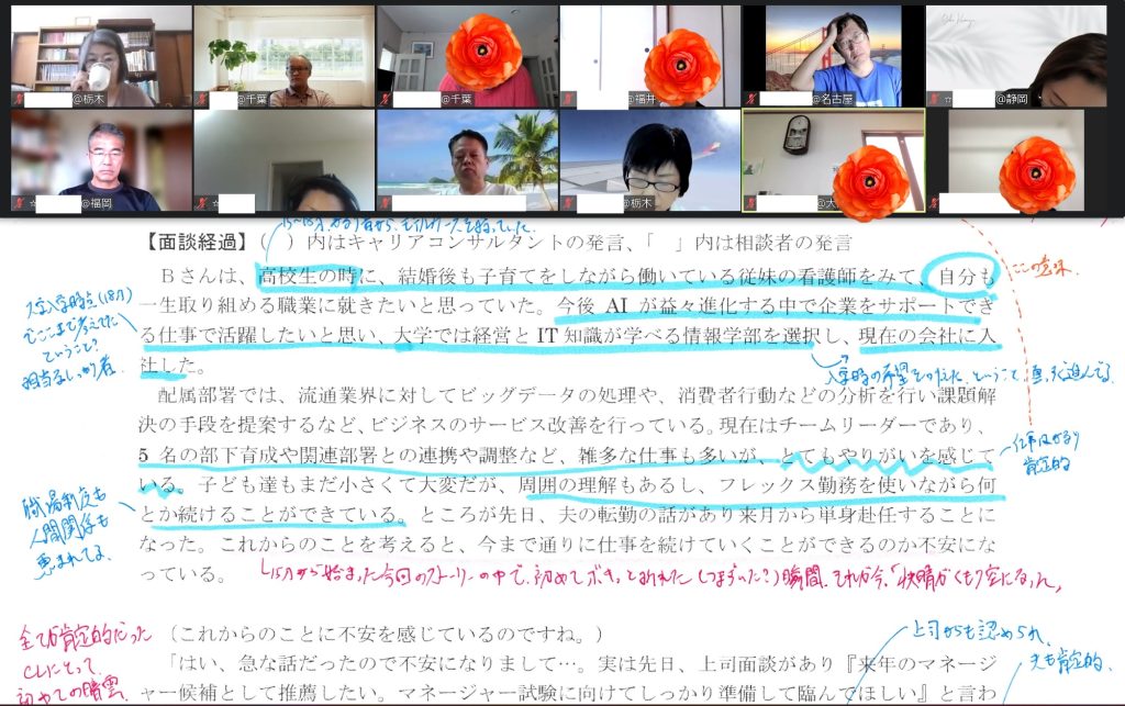 今回も新しい発見でした!ありがとうございました。論述の書き方が分からず、このままでは論述も通らないのではないかという不安から受講しました。受講してよかったです。私はCLの気持ちの汲み取りを”さぼっていた”のです。この受講でこのことに気づくことが出来てよかったです。CCとして本当に仕事をしていくためには何が必要なのかよく考えるきっかけにもなりました。奥さまへの想いを話してくださって、先生の人柄も伝わってきました。ありがとうございました。