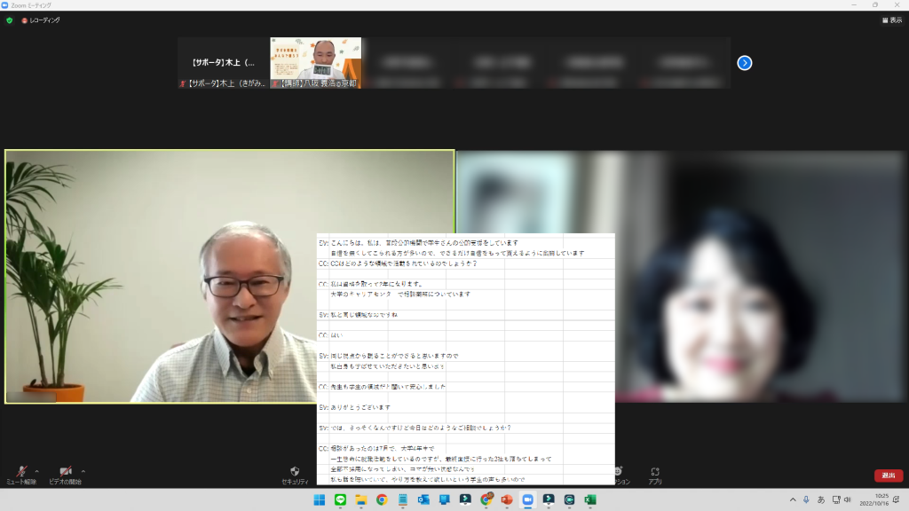 この度もお世話になりました。ありがとうございました。八阪先生の説明は毎回わかりやすくありがたいです。ロープレ見学は、オブザーバーとして冷静にとらえることができますが、実際の面談では冷静には難しいことですので、いかに落ち着いて自分自身を捉えるかであると感じました。たいへん学びになりました。ありがとうございました。