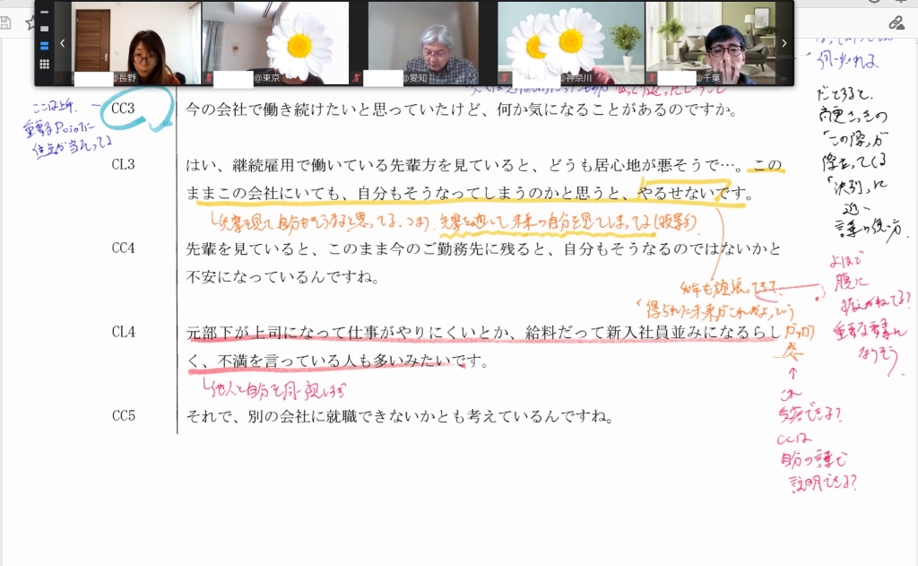 指導者の視点からCCの話しの流れ、言葉の表現などに着目し、CCの感情、CLの応答の良い点・改善点の解説を受けた。