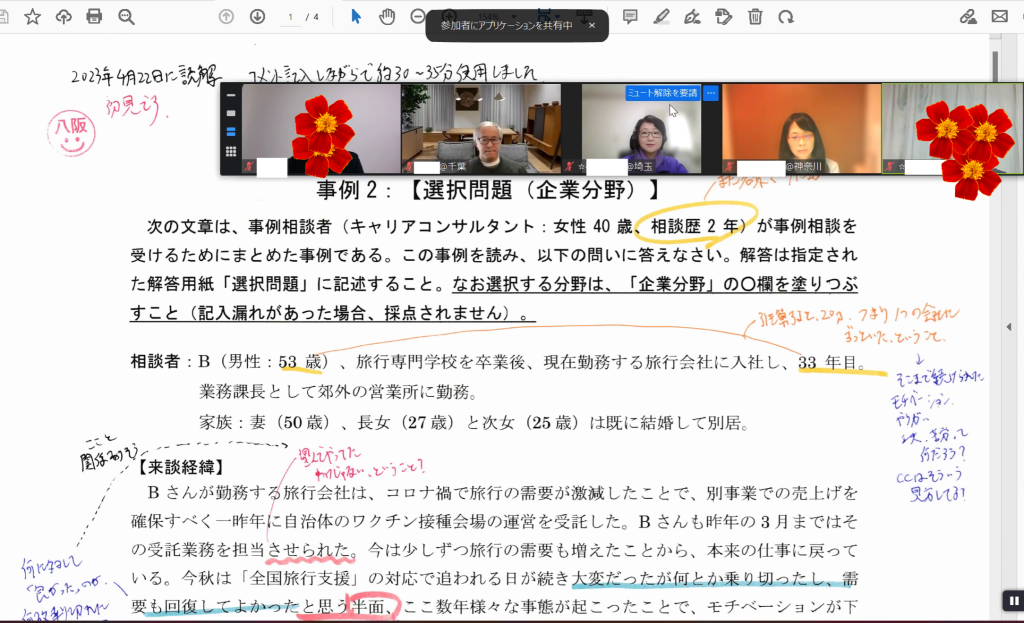 「・・・させられた」、「半面・・」、「・・が」等々、ただ事例を読むだけではさらりと流してしまいそうな短い単語ひとつにしても深い意味があるのだということ、先生からの説明にとても納得しました。