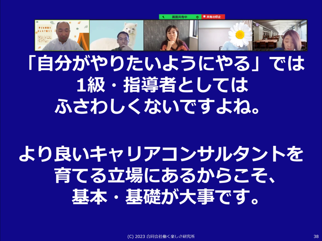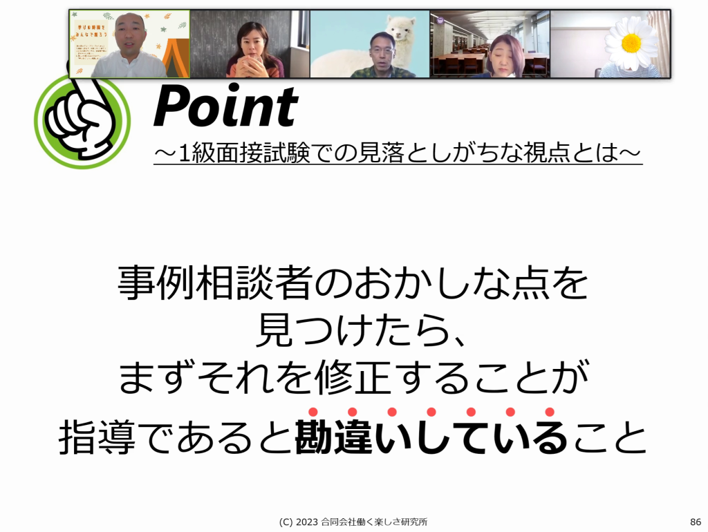 事例相談だからと構えるのではなく、普段の相談と基本の姿勢は同じ(目の前の相談に来ている人に真摯に向き合う)で良いのだということが学べました。変に「指導できなければならない」と思い込んでいた意識を下ろすことができました。
