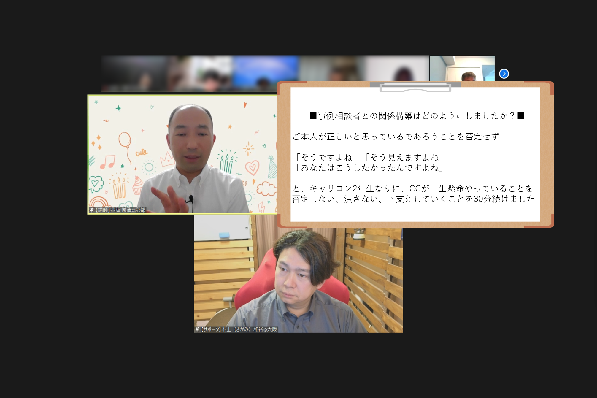CC2年生の事例相談者をどこまで労い、温かく迎えるか、そんな部分もぜひ参考にして欲しいです。