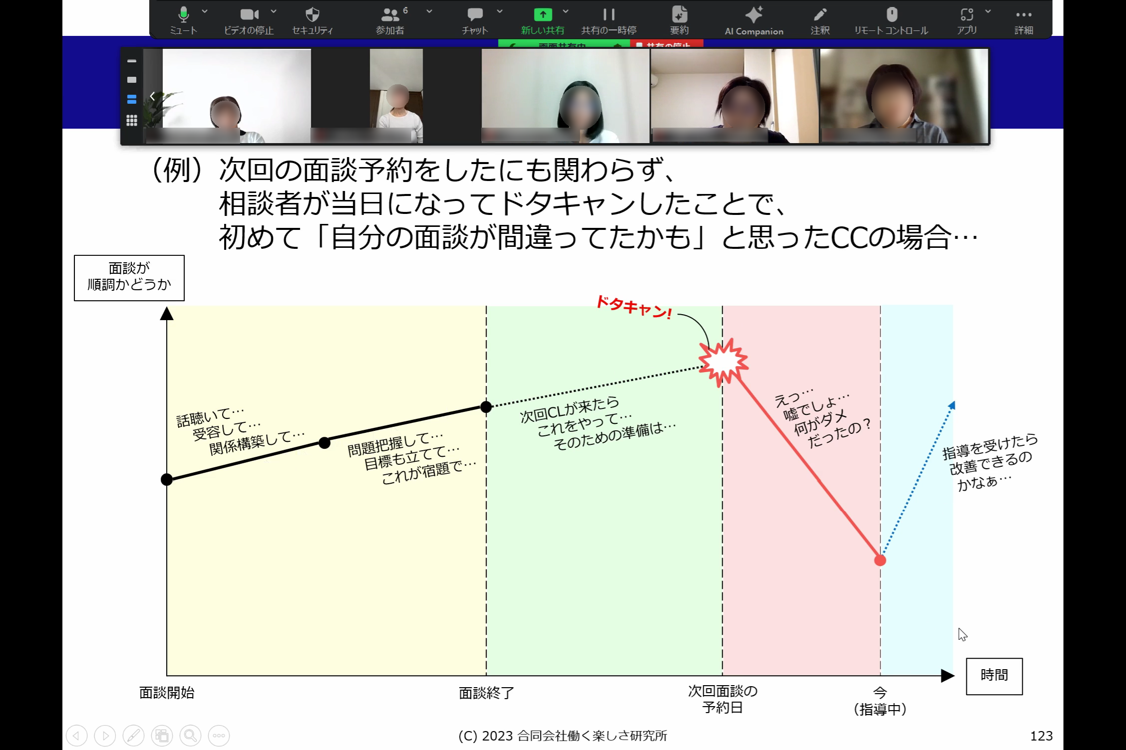 準備講座同様、非常に理解しいやすかったという意味で「適切」な難易度でしたが、とても自分が再現できないという意味では「とても難しかった」です。ロープレの当事者になると冷静でなくなってしまうので、手を挙げずにいたのは申し訳ないなと思う気持ちもありましたが、今回は見学のポジションでいて良かったです。