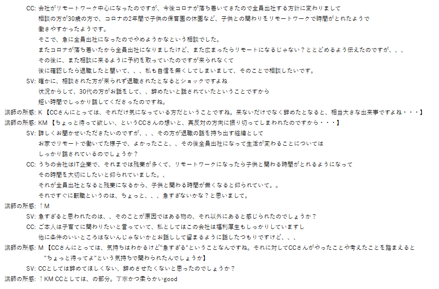 「CCさんの上達のためにという今日の目的のところをお話ししたいのですが・・」の言葉は、以前に先生にご指導いただきましたが、なかなか使える機会がなく、自分でもタイミングでハードルがあります。主語をあなたに変えて、「あなたはどう思いますか」「あなたはどうしたいですか」は、CCに焦点が当たり、CCも受け入れやすい関わりだと、すごくヒントを頂きました。主語に注目は、「私」になっている場合は、バイアスがかかっている。自分がやりたいように引っ張っている。主語の意味付けを意識するとより事例相談者を理解できる。その後の具体的展開もイメージが付きました。パターン化は良くないですが、気持ちの余裕にもつながると思います。