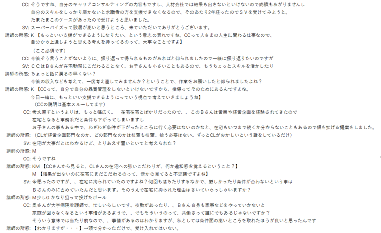 ●事例指導中に事例の内容やCLに焦点を当てて話を進めていた中で、折角「CCの支援方針テーマ」についてCCが話をしたのに、SVが事例の細かい内容について振り返したことで、再度、事例内容の細部に戻って話が続いてしまう。