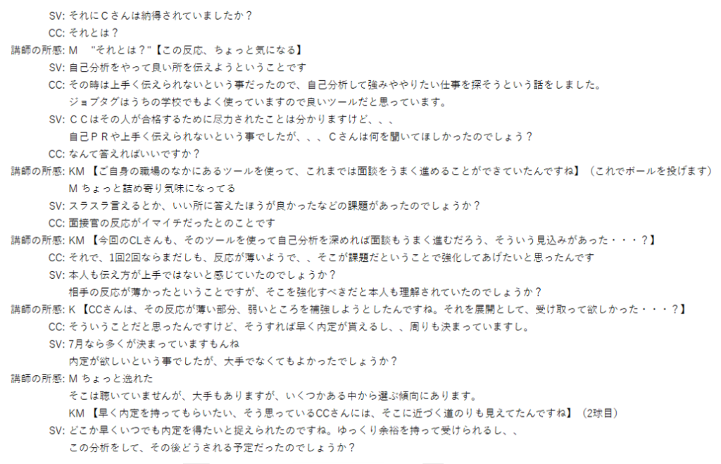 また、相談者の言う「面接でうまく伝えられない」は、「面接の際」だけなのか「いつも」なのかもしっかりと聞かないと状況が把握できないことから、ケースを俯瞰的に観ることで事例相談者の癖や傾向が見えてくることも、今日のロープレで改めて体感しました。