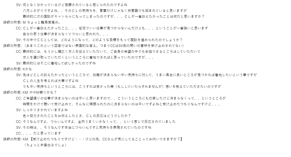 今回の講座では、自分の改善点が具体的にわかるとても有意義な場をいただいたと感じており、大変感謝いたします。(これらを実際の面談中にリアルタイムで行っていけるか?が大問題ですが・・・)