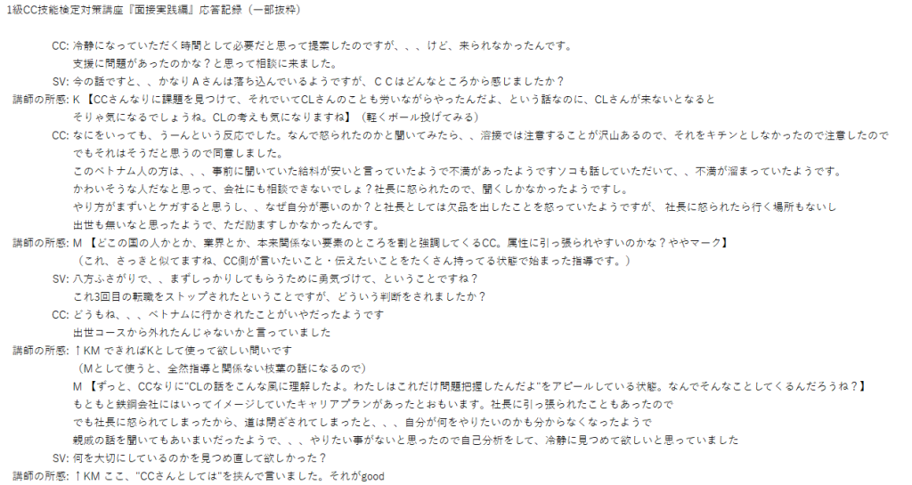 まずCC役としては、後から自分の映像を見ても、情報量が多いCCになっていました。速記録の内容をみても、私が演じたCCの状況の返答や、八阪先生が考える対応(私ならこの様に会い向かう)というメッセージ見させて頂き、自信が演じたCC役「自分から喋ろうとする」「話を振られる前に遮って話し出す」を既に自己紹介の段階で判断され、今後に続く展開、事例に対しての準備を行っているいる点、このような特徴をもったCCが本当に相談者に向き合い話を聞けているのかを想像してみる。との追記もあり、相談内容初期段階で、CC観察がここまで進んでいるのは改めて衝撃でした。
