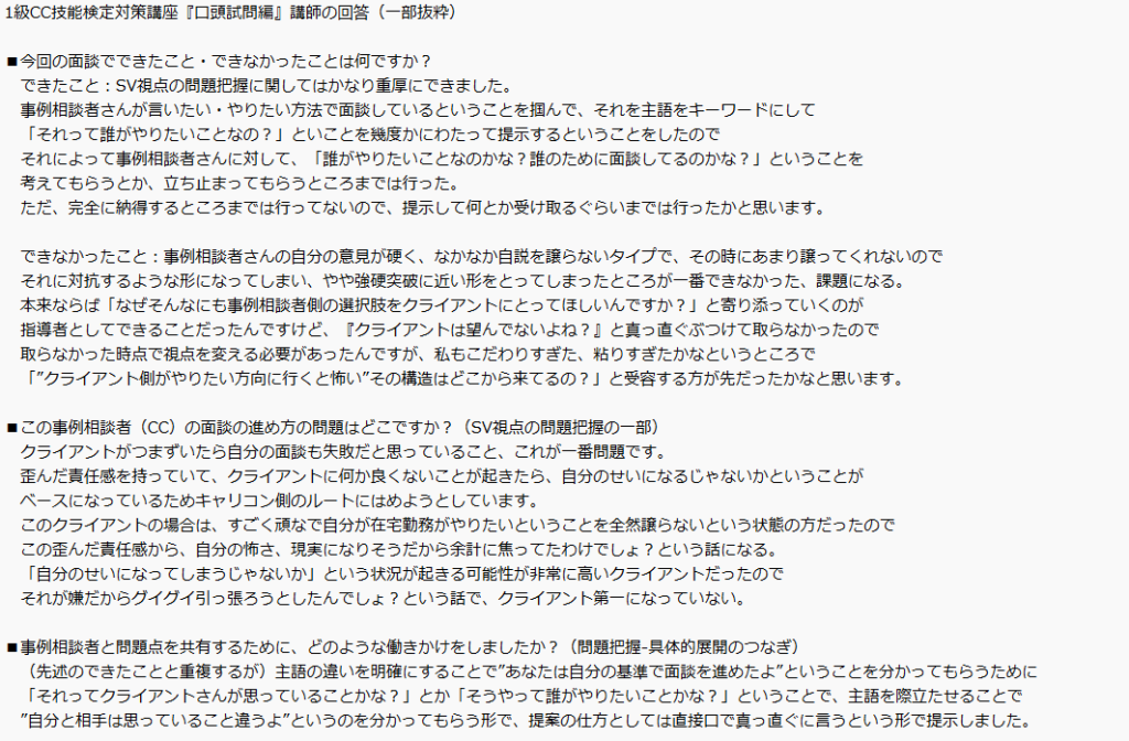 1級の試験では、面談で何が問題であるかということ以上に事例相談者が聴ける状態になっているか、事例相談者が聴ける状態になるためにSVとしてどれだけ事例相談者の今回の事例や普段の面談に対する思いをどれだけ聴けたかを見極める必要性を強く感じました。