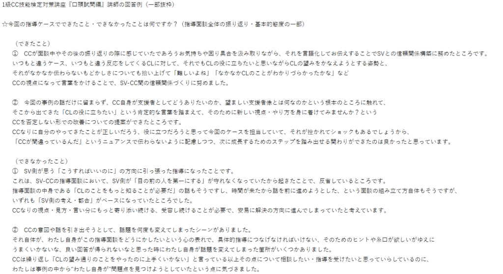 また、こちらも1級という資格を考えれば当然ではあるのですが、常に「育成」という視点を踏まえ伝える必要があることも改めて認識した次第です。出来たこと、出来なかったことについてはつい、やったこと言ったことを話すのみになってしまっていましたが、育成という観点から、それがどこに指導の効果として現れるのかを踏まえ伝える必要があることに気付きました。ロープレ中も、その後の口頭試問も、常に、”育成”というキーワードを忘れず、自分が行うこと、話すこと1つ1つについて、その根拠は?その意図は?狙った効果は?ということに意識を向けるようにしたいと思います。