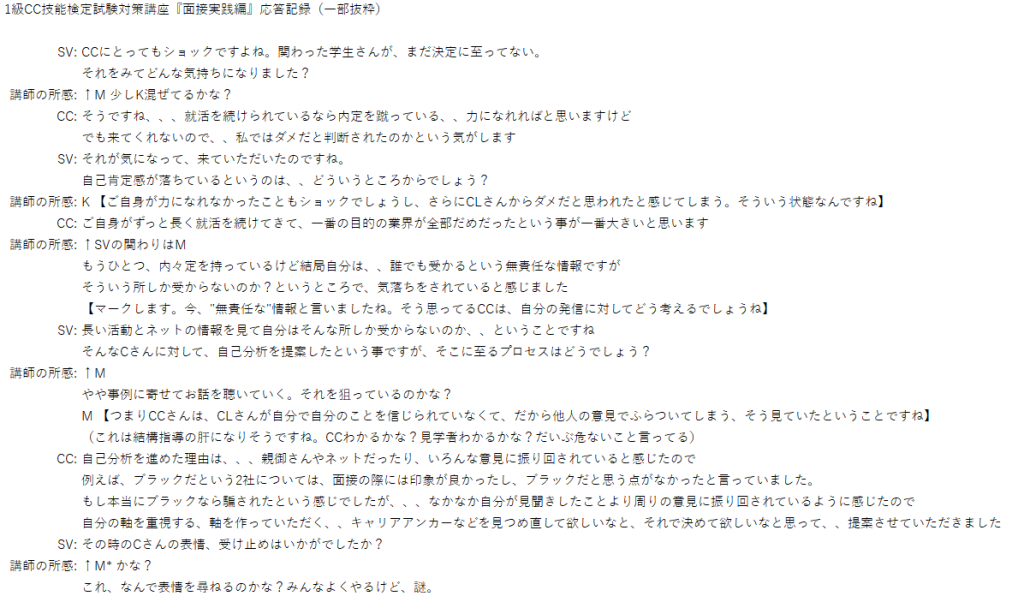 特に面談ライブで指導者の関わりがK…関係構築、M…問題把握、G…具体的展開のいずれなのか(どちらとも取れるとか、そのような意図で伝えているのかとか)、その他どのような応答が効果的か、また次につながる質問はどのようなものか…といったコメントを同時チャットでお伝えいただけることの分かりやすさ、ありがたさをつくづく感じながら聞いておりました。