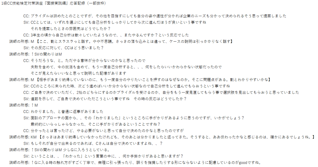 3名の方のお手本ロープレを拝見して学んだことは、とにかく相手のペースに歩調を合わせるということです。相手次第で面談はどう転がるかわからない、それがわかったことで、少しだけ楽な気持ちで試験に臨むことができそうです。いや、緊張はマックスではありますが…。必死で逐語を起こしました! 本日はそれをプリントアウトしたものを携えて会場に入ります。