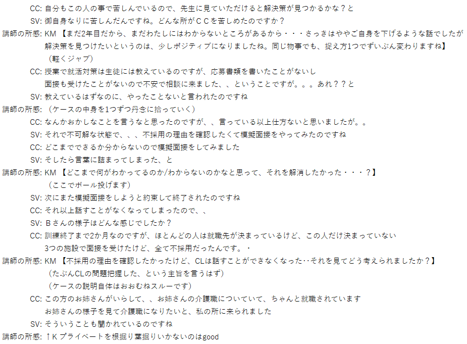 準備編で先生が、SVがCCに心を寄せることで、CCのお手本になる、口先だけではない、心を寄せることの大切さを実際に感じてもらうということをおっしゃっていて、準備編ではその通りだと深く納得していたのですが、実際に事例に触れると、CCに対する否定的な気持ちが湧いてきて、本当に難しいことだなと感じました。