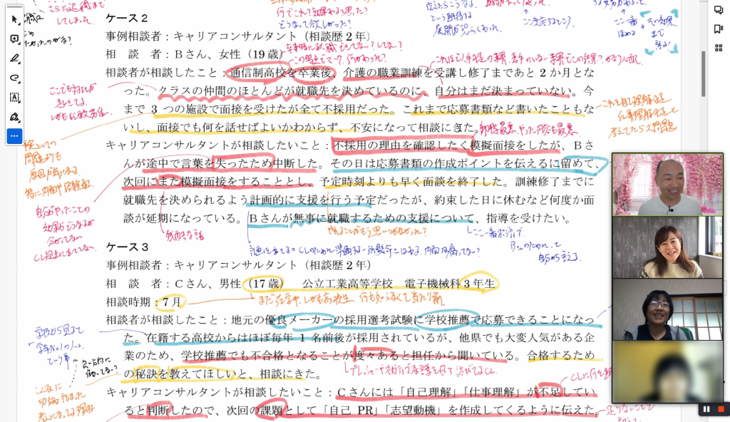 面接準備編で教えていただいた通り、目の前の事例相談者が何をやりたかったか?を考えて、できるだけわかりやすい言葉を使って話すことを心がけました(いつもは、面談を構造化して15分目で要約を入れる、20分目もでに目標共有するなど意識したり、システマティックアプローチやキャリア理論からレッスンをしようとがんじがらめになっていました)。その結果、事例相談者の自然な言葉から振り返りすることができて、面談の楽しさを少し思い出すことができました。
