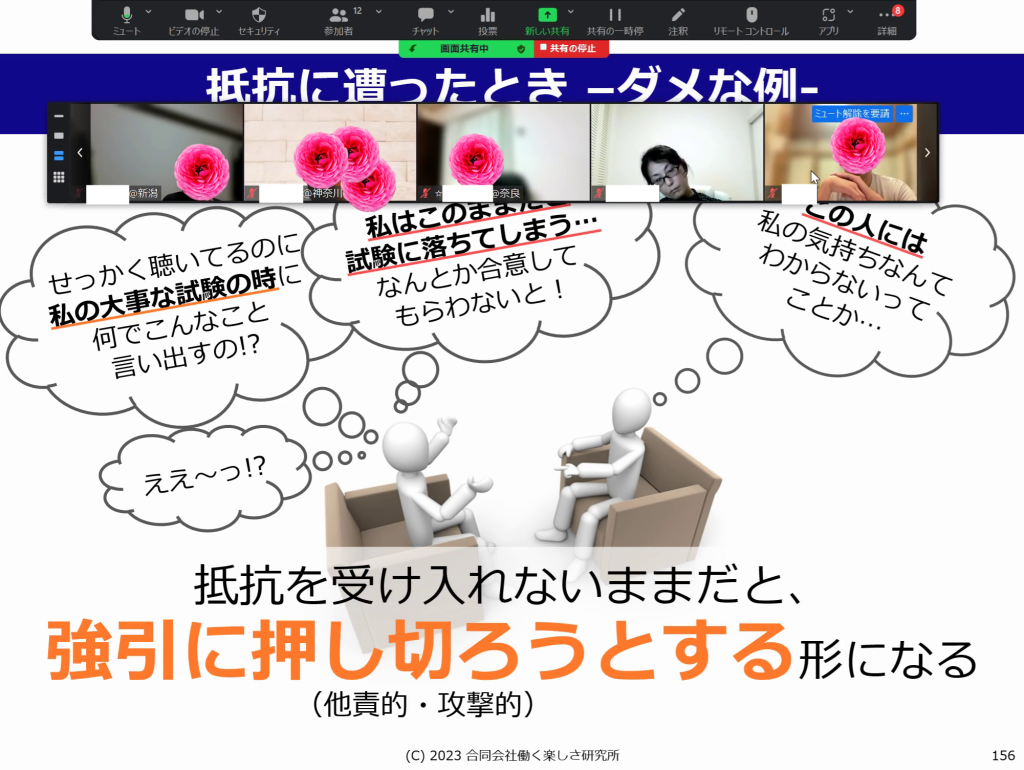■「相談の場だけやろうなんて無理、日々練習が必要」という言葉はその通りだと突き刺さる気持ちでした。相談の場以外の、職場の仲間や、家族への対応はどうだろうか、瞬発的に反応して次々と返していないだろうか、相手が気づいてほしいことに焦点をあてる努力はできていただろうか。相談じゃないからと蔑ろにしていたんじゃないかと反省することばかりが浮かんできました。