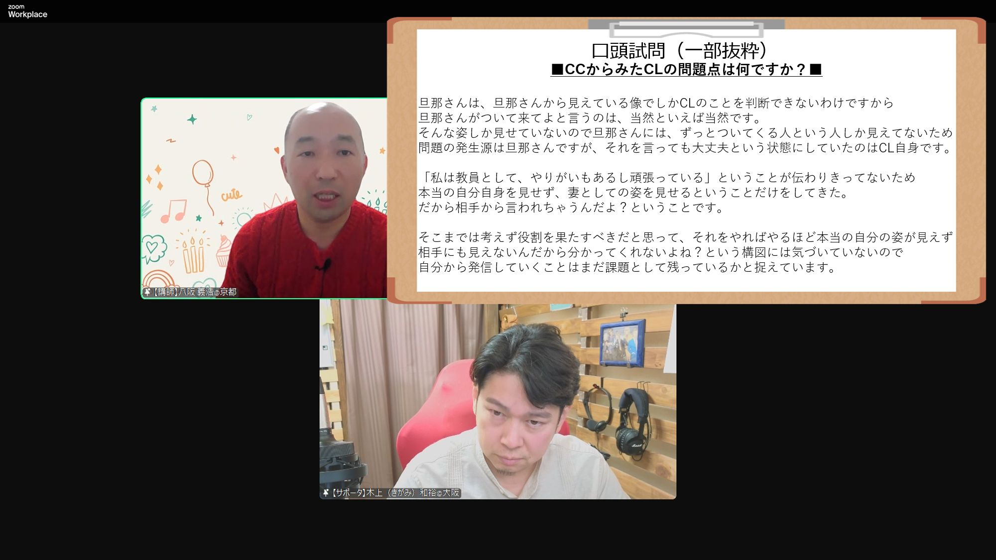 ご自身で面談しながら場面場面で札を挙げて下さることで、見ている私たちも今何が行われているのかがわかり、さらに解説を聞くことで理解が深まりました。購入したお手本動画でも思ったことですが、先生の頭の中の解説を聞いていると、そんなに客観的に自分の面談を把握しているなんてすごいとしかいいようがありません。先生がお山の頂点で旗を振っている人なら、私はまだ1合目にもたどり着いていないのではないかと思います。