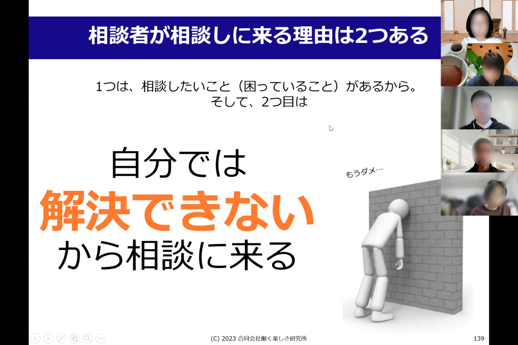 今回も盛りだくさんの学びをありがとうございました。初めてリアルタイムのお手本編に参加させていただきました。いつも先生がおっしゃっている「徹底的に相談者との関係構築を」のこの【徹底的に】というのが今回もぶれることのない面談でした。
