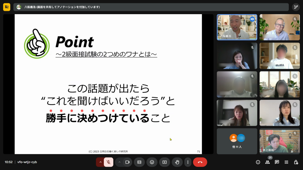 普段のコンサルティングでは、相談者の役に立っているのか自問しつつも相談者の反応からしか自己評価できないため、これでいいのか自信を持てず、もどかしさのような感覚がありましたが、本日の授業を通じて「相談者のために」、という徹底した先生のお話にとても共感できました。