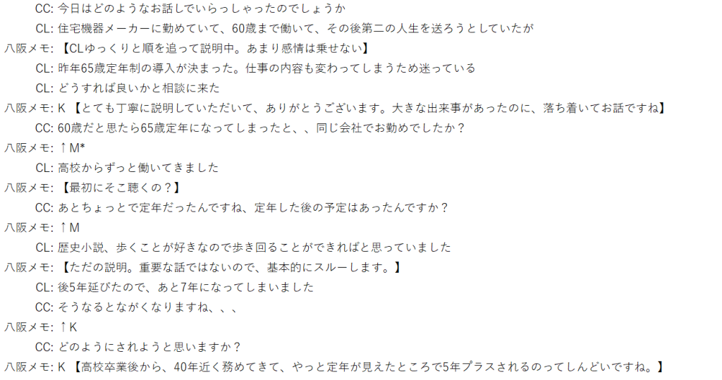 今日は、ありがとうございました。実際の面談時で、CL中心を考えながら、CCの役割は何かをか考えされられたロープレ練習でした。CCの都合で話を進めると関係構築も得られないことを目の当たりにし、CCほど度量を持ってCLと温かい気持ちで受け入れることを再確認いたしました。また、頑張ります!!