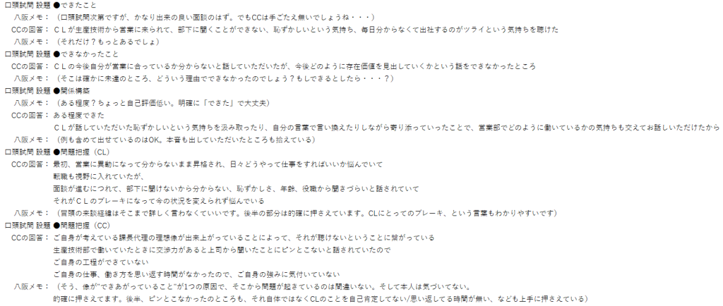 実際は面談後、すぐに自分のロープレを振り返り実践できないといけないことだと思いますが、その点も踏まえて勉強になりました。まだ、録音を聞くのは今からで、更に自分の至らなさに気がつくと思いますが自己研鑽のため聞き直したいと思います。本日はありがとうございました。