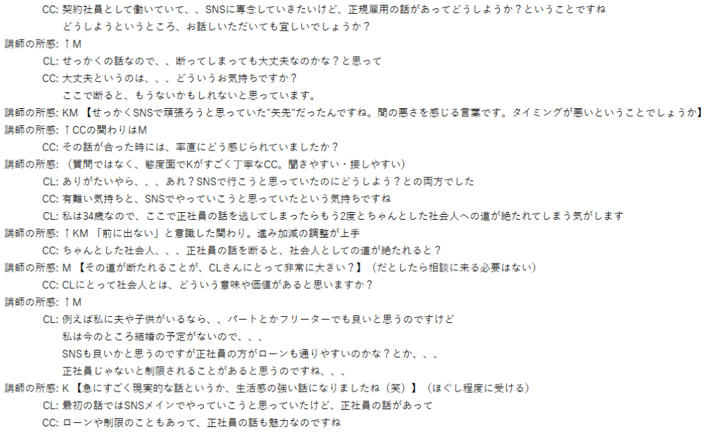 ロープレ側で今回参加させて頂きました。以前、見学時に『具体的展開は、キャリコンが”そうなったらいいな”と思う事を話しても、クライアントがそれを望んでいるかは分からない』と言うアドバイスをしていて、大変心に残りました。