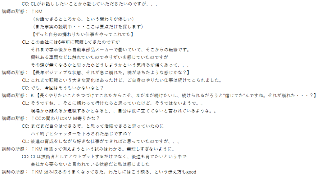 また別のケースでは、冷静にご自身の面談の進捗具合を判断しクライエントに負担をかけている出口が見えなくなっているとCC自身の面談癖に気付かれ改善を言葉にした勇気のあるCCのケースを拝見することが出来て心が震えました。