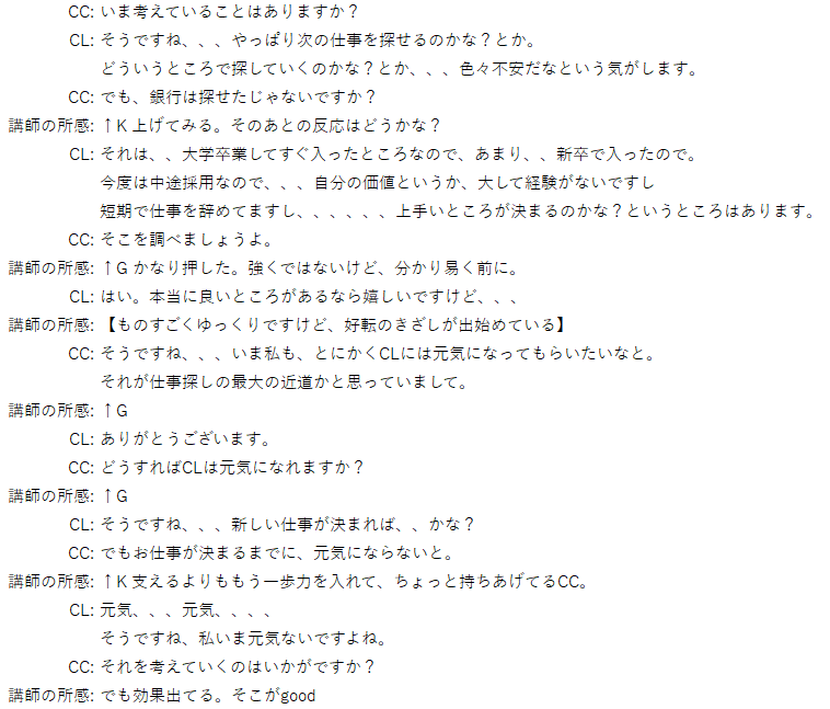 次に同じくメールにある午前ケース2で、学生が内々定先に満足しているのにまた就活を再開しようとしている、そこに矛盾がありそうでそこは突いてよい、という点です。これもCCの質問やCLにたくさん語ってもらうことで見えてくる、そしてそのような「だとしたら、おかしいよね」ということはCLの気づき、変容になるので見逃さずに投げかけたいです。シナリオがあるので、この学生のケースはこんな展開も結構想像できるので対応できそうですが、他の社会人シナリオも詰め込みすぎず適度に頭に入れ、目の前のCLの話、気持ちを受け止めます。