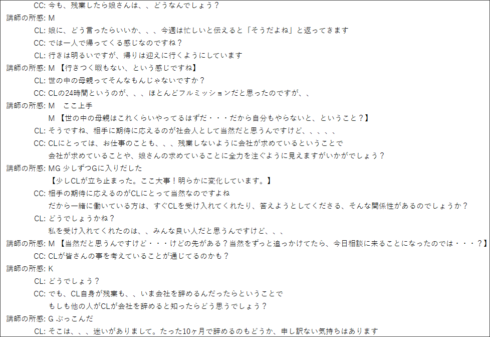 また、面談開始時点から「このCLは気付いていないことがあるはず!」と問題意識をもって相談に臨むことが大切であることにも気づかされました。まさに私は関係構築をしてから問題把握をしているタイプです。毎回ながら多くの気づきがあります。本当にありがとうございました。
