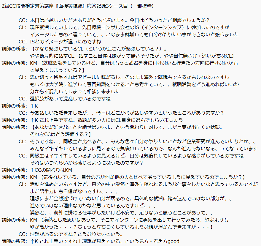 CC役はこのCLからは方策が思い浮かばないとおっしゃっていましたが、CLとしてはCCとお会いして話したことで一人で悩んでいたことに終止符が打てましたし、これがきっかけで、面談後ですが、現実的な自分なりの就職活動プランを考えてみようと思うようになりました。