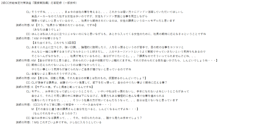 CL自身が困っている・何とかしたいと言っている事を優先的に汲み取る場面を見みることができ、更に口頭試問でもCCの言葉でCLの感情から抜け出すためにはに及ぶ解答で、これが2級レベルなんだと実感しました。