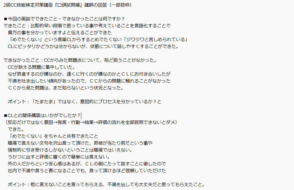 ポジティブな方向に誘導することは、CLの本来の感情を否定することになると知りました。沈んだ感情もそのまま(時に「え、それは違うんじゃない?」とCCが違和感を感じたことでも)いったんそれを受け入れる姿勢がCCに必要だと再認識しました。今回はリアルタイムで先生や木上さまがコメントを入れてくださったので、その様子がよく分かりました。