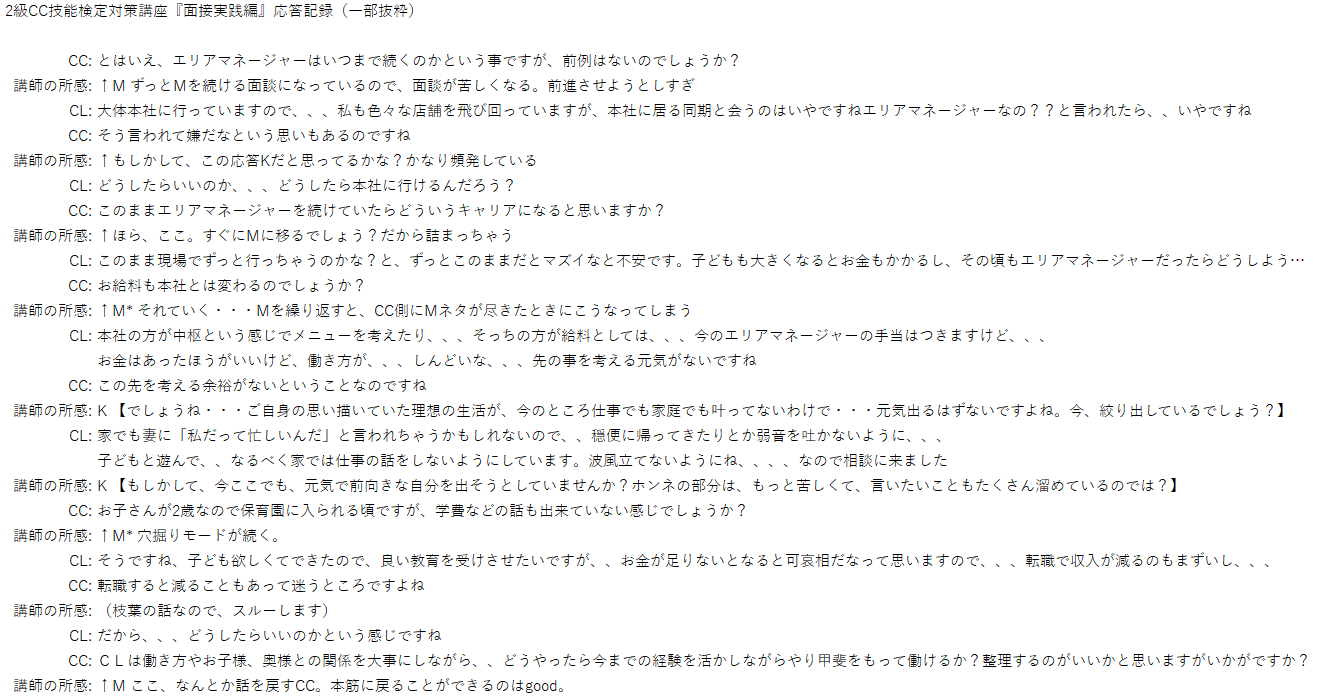 私ならズルズルと行ってしまいそうになる所ですが、CCさんは意図的にあの質問をされたと思うので、面談を俯瞰してみることができているからこその関わりと羨ましく、こういう力を身につけたいと改めて感じました。