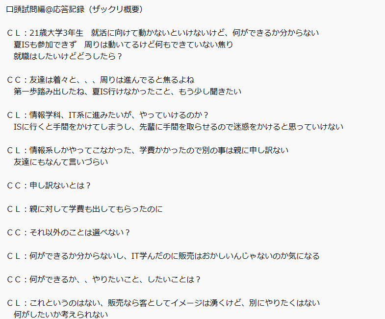 2級面接実践編に見学者として参加させて頂きました。冬の試験の時から繰り返し目を通しているケースのロープレを見学させていただいていますが、なかなかCLの問題がつかめずにおり、ケースを見学しては、果たしてどうやってかえすのがよいのだろうと、電車の中で、逐語録を見返して考える日々です。自分の中で、CLの情景が描けていないことが、この原因かなと思っています。今一度、面接事例読み解き編で学んだケースの分析を、今一度、自分でも振り返ってみたいと思います。