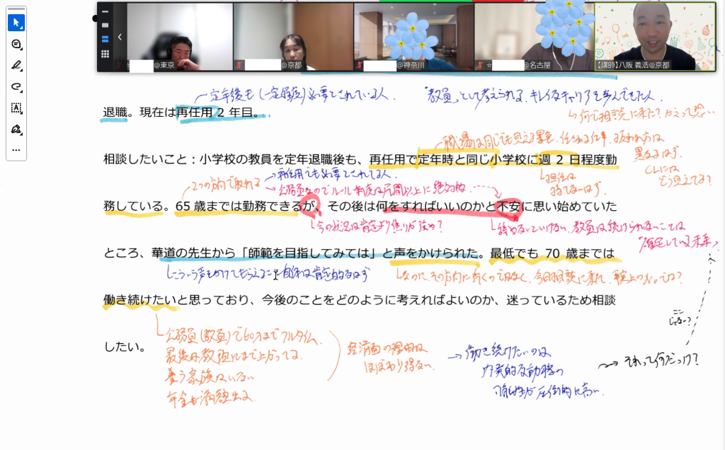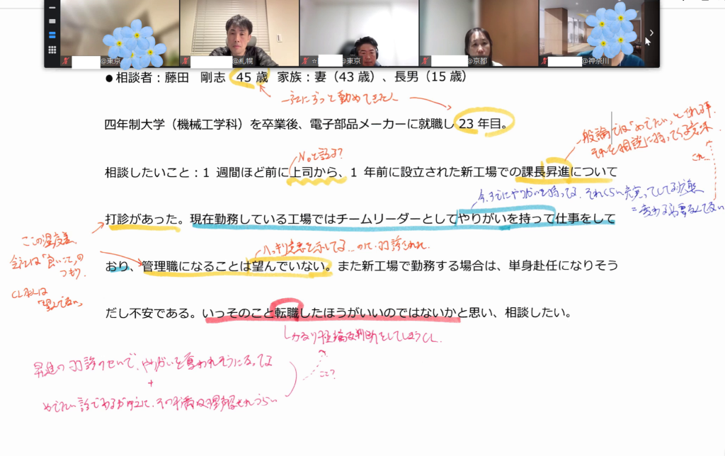 問題文を上辺だけ読むと、夫の早期退職につきあって実家に帰ることになったら、念願の教員の仕事やめなきゃいけないのか、どうしたらいいかわからない、で終わってしまう。しかし、色分けやグラフで見える化すると、教育学部に在籍するも食品会社に就職し結婚退職し子育て終了後、念願叶った「教員」を仕事にできた9年間はどんなものだったのか、やめる決断ができない中、また同じ時間軸で進行している母親としての育児から介護への役割変化に対し本人はどうしていきたいのか、など相談者の生き様にすっと集中できました。そして聴くことで理解を深めながら点と点をつなげていけばずれていくことなく、同じ絵を見ながら不足を確認し、満足できる絵の完成を話し合えるのかな、と手応えを感じました。