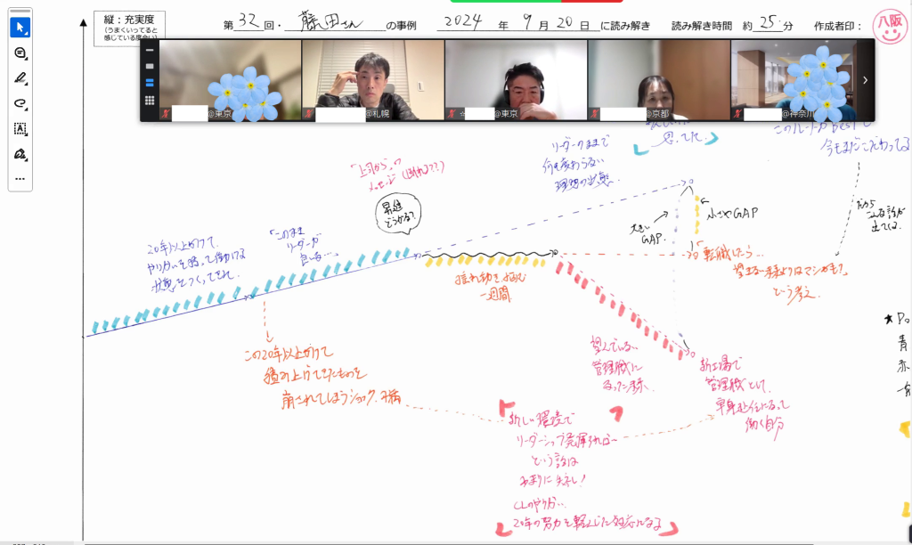 ただ、いざ私ももう一度、藤田さんや関口さん、喜多さんのグラフを引こうとおもってみると、関口さんの読み解きを「特殊」と言われた理由がとてもわかります。藤田さんや喜多さんは、ある意味、グラフを引きやすい。でも、関口さんは、関口さんのおそらく感じでいるであろうことを八阪先生が沢山補って引いてる。事例に対して、グラフが引けないという自分がいたら、そこはリアルの研鑽ポイントになるなぁと思います。