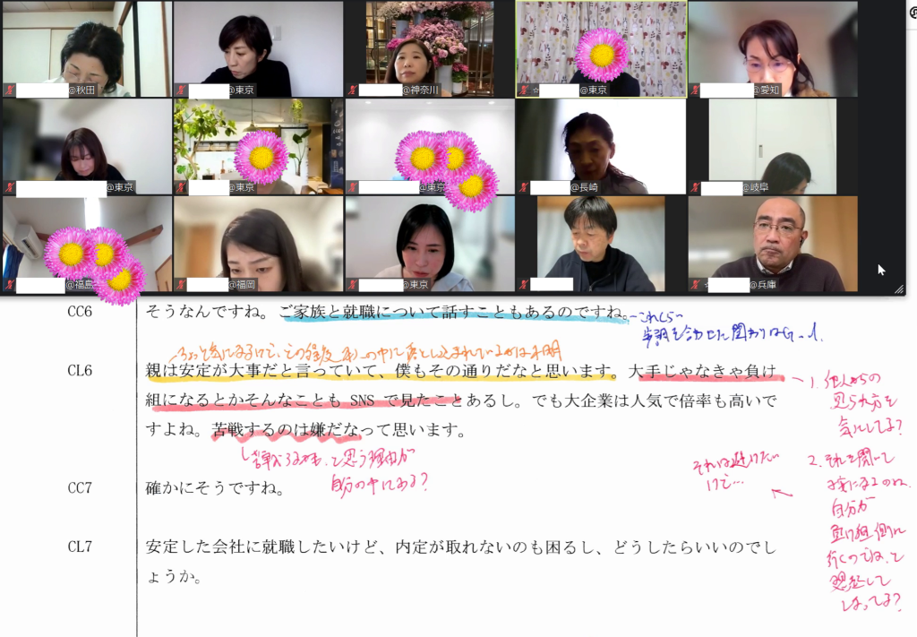 私の場合「あーこの人こういう考えね」とか「いやいやその考え間違っているよ」と思いながら進めているのだとわかりました。なので実務ではいつもCCである私が主体です。人様の人生に係わる大事な職業ということは重々承知していたつもりですが、その解釈が間違えていました。