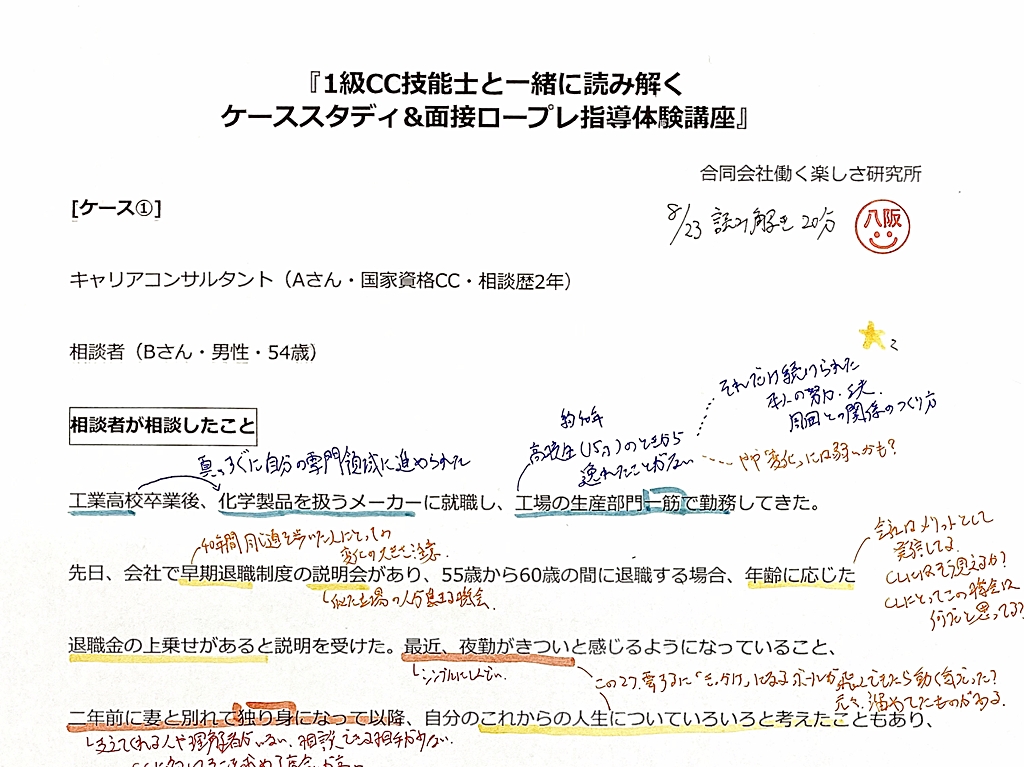 午前中の講座で、文書を読み、CCとしてはまず、転職するの?と言う思いがありながら、何度も読み、キーワードについて考え何度も読み進める事の大切さを感じました。最初に読んだ時と、読み進める中で、主訴が最初考えていたのとは違うと感じていく…これで良いと言う事が分かりホッとしました。それぞれの視点があり、色んなケースを考える事ができました。