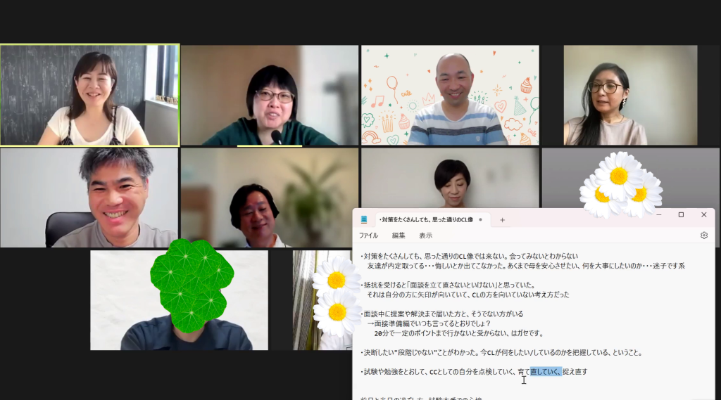 印象的でしたのは、「冷静さ」「客観性」です。自身のロープレを客観的に振り返られる冷静さに驚愕しました。自分、自分ではなく、目の前のCLに確り向き合っているから出来ることなんだと腹落ちしました。