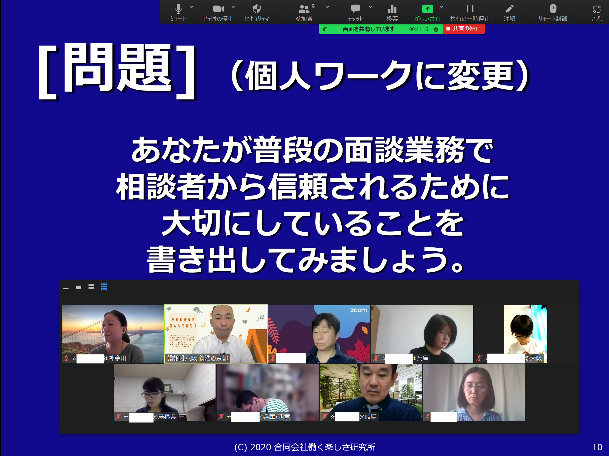 また、支援者として自分を律する厳しさも教えていただいたように思います。身が引き締まる思いでした。それでも相談業務を自ら選んで仕事にしているのだからいい仕事ができるように頑張りたいと思います。受講させていただきありがとうございました。