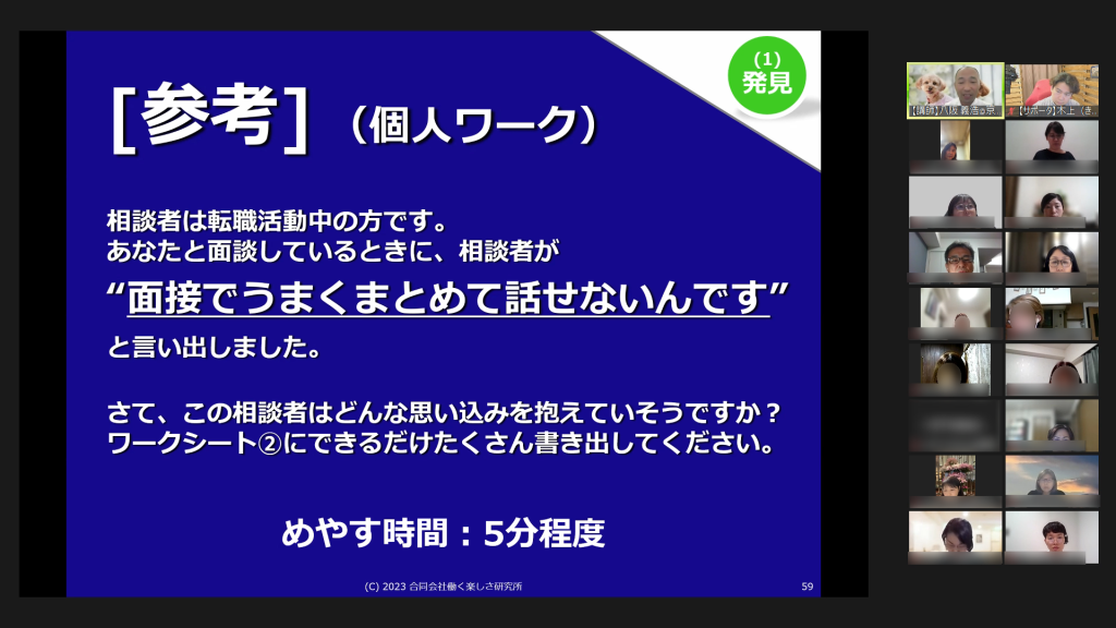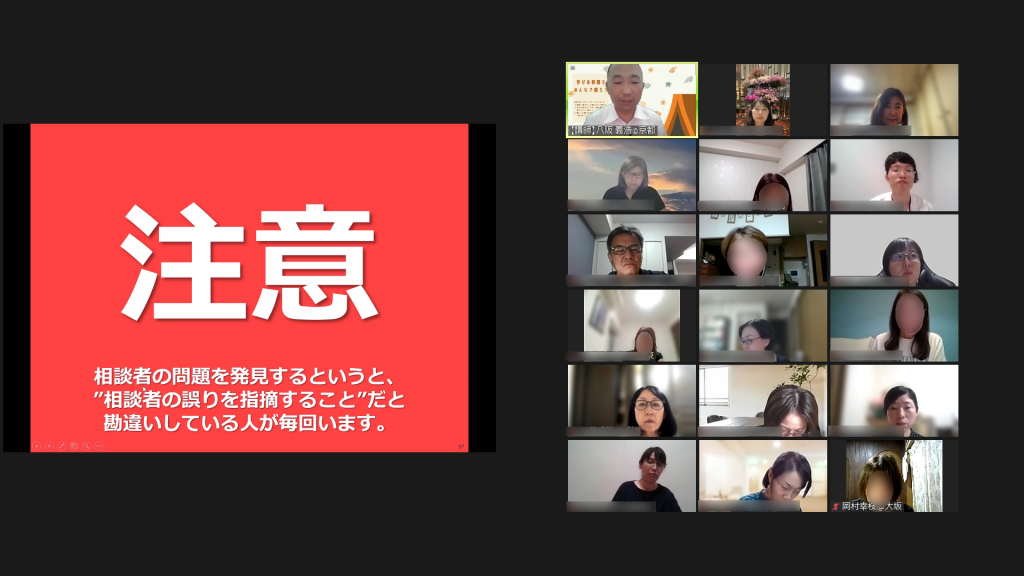 ■八阪先生、木上さん、参加の皆様お疲れさまでした。地震発生時の避難指示連絡もあり、安心安全な場作りは面談時だけでなく日常でも必要だと、CCとして、人として目指したい姿を拝見しました。全員の安全を願う気持ちが伝わってきました。無事受講でき良かったです。