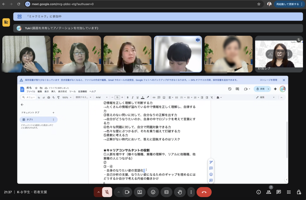 しかしこのような支援方法では学生が社会的、職業的に自立するための支援に繋がらず、自らキャリアを考えることとは程遠くなり、長期的に学生のためにならないと改めて気づかされました。学生に話をさせて、それに対してキャリアコンサルタントが良いとか悪いとかの価値観で助言をせず、伴走することで学生に考えてもらい、自ら答えを出せるようにサポートしていきたいです。