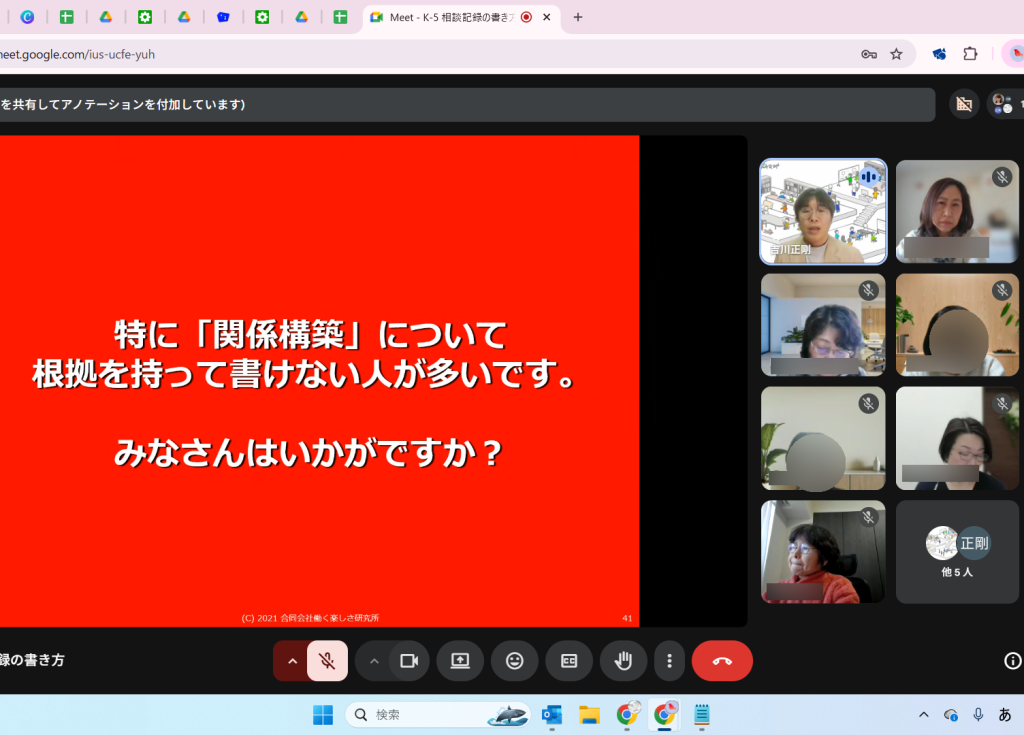 関係構築、記録の必要性について学びました。相談者理解のために関係構築は必要だと頭では理解していますが、実際には行うことなく面談を実施してきたと感じています。また、大きく学んだことは自分が行ってきたのは記録ではなく、メモだったということです。自分の後に担当した人に引き継ぎできた内容だったのか、おそらく属人化していたのだろうと強く感じています。