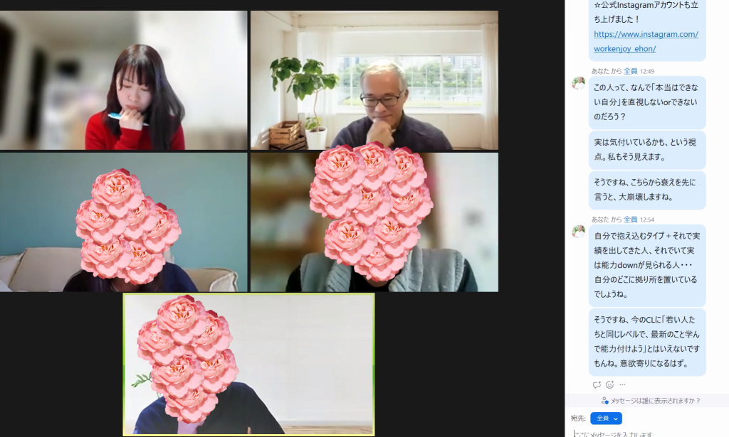 先生の講座を受講し、毎回自分自身の面談を考えるのですが、本日は自分自身の内面を知るというか、はっきり浮き彫りにされたというべきか、少しショックでもありました。