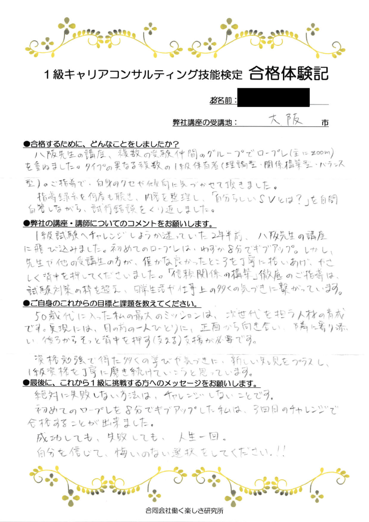 ブログ 2021.04.10 2023.10.27 合格体験記初ロープレは8分でギブアップ。3回目で合格することができました。執筆者 | 合同会社働く楽しさ研究所 大阪府・需給調整機関領域・第10回合格「絶対に失敗しない方法は、チャレンジしないことです。初めてのロープレを8分でギブアップした私は、3回目のチャレンジで合格することができました。成功しても、失敗しても、人生一回。自分を信じて悔いのない選択をしてください!!」1級CC技能検定対策講座のご案内ページはこちら一覧へ戻る