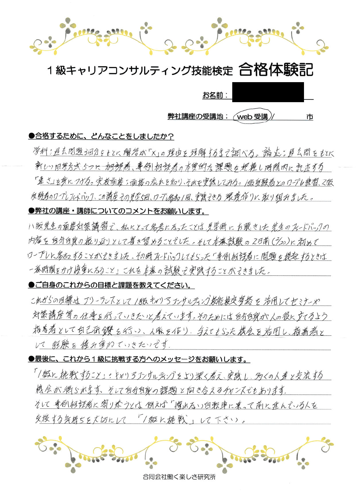ブログ 2024.04.11 合格体験記CCに問題提起するときは一番時間をかけて、慎重になること。 執筆者 | 合同会社働く楽しさ研究所 神奈川県・企業領域・第13回合格 「本場試験の2日前に初めてロールプレイに参加することができました。そのときにフィードバックしてもらった『事例相談者に問題を提起するときは一番時間をかけ慎重になること』これを本番の試験で実践することができました。」 1級CC技能検定対策講座のご案内ページはこちら 一覧へ戻る